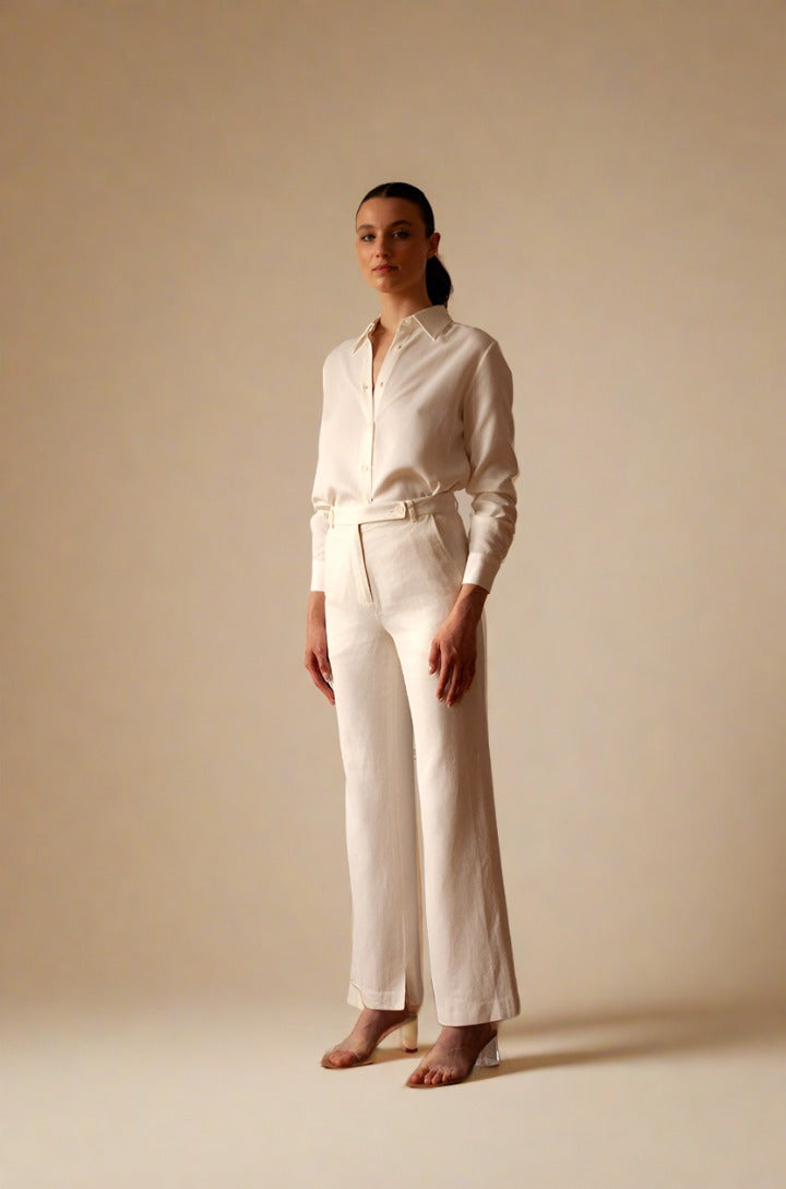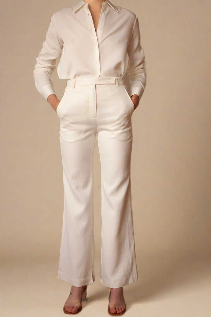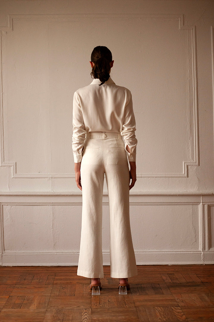 Mid-rise pants with slanted side pockets, back double welt pocket, belt loops, Inner leg slit.