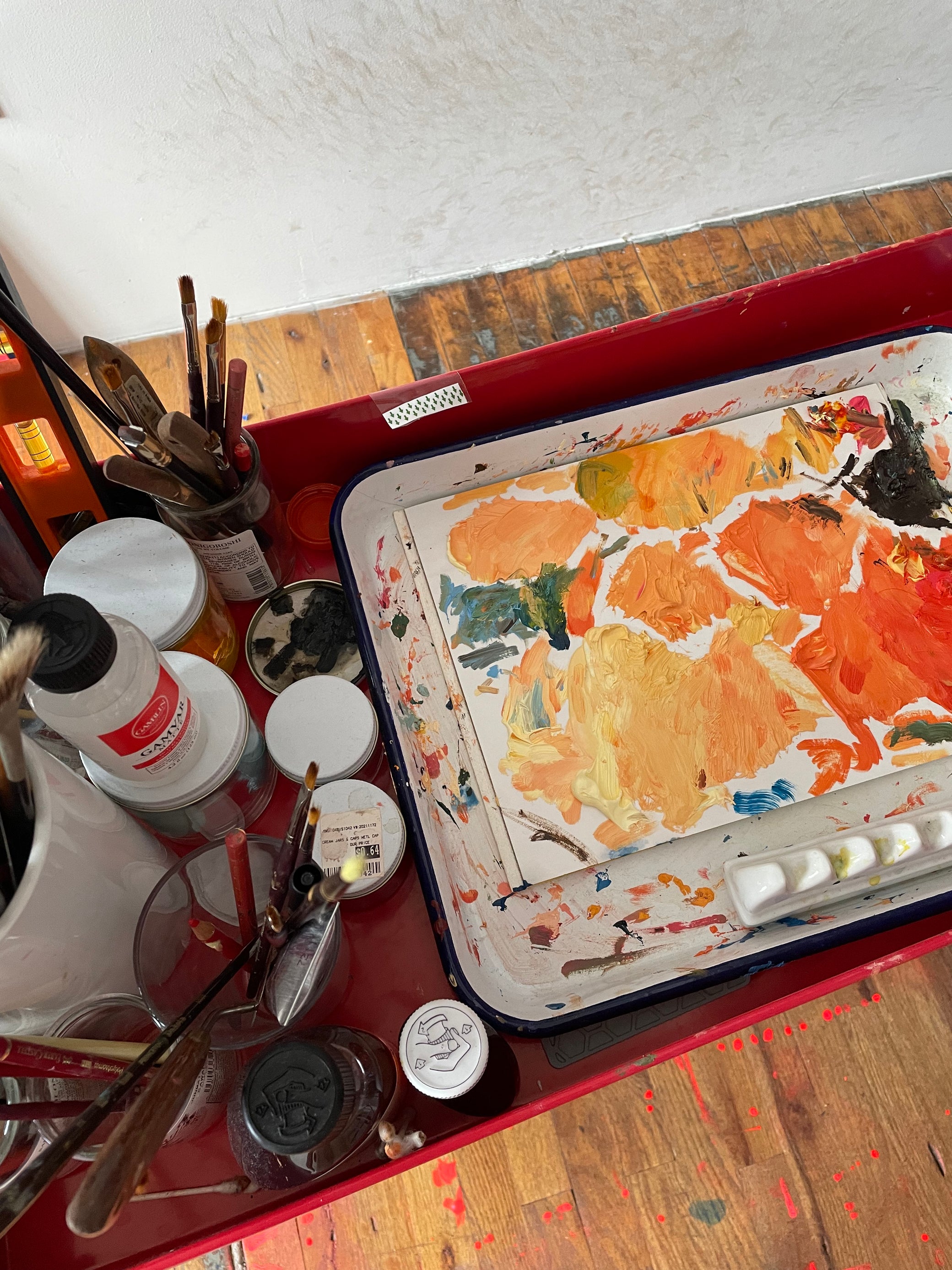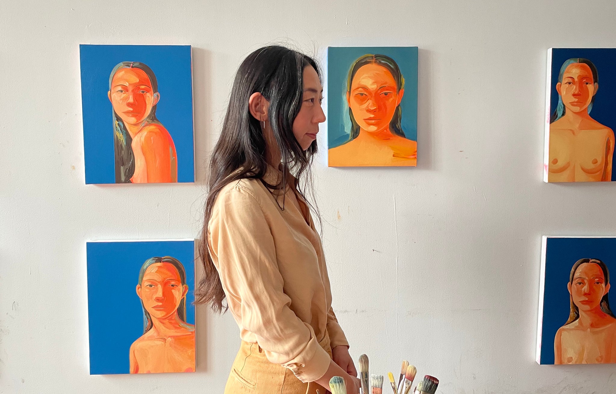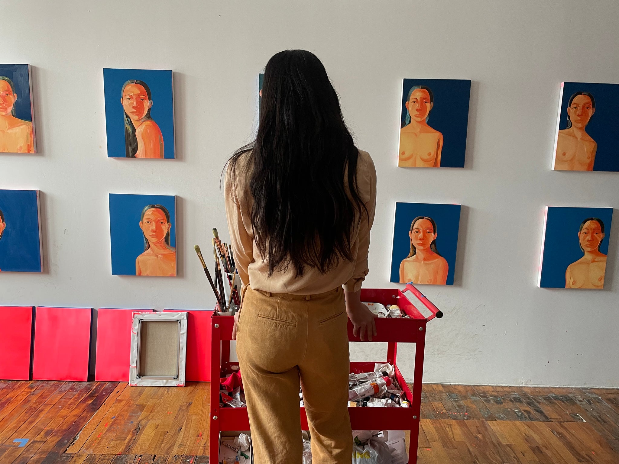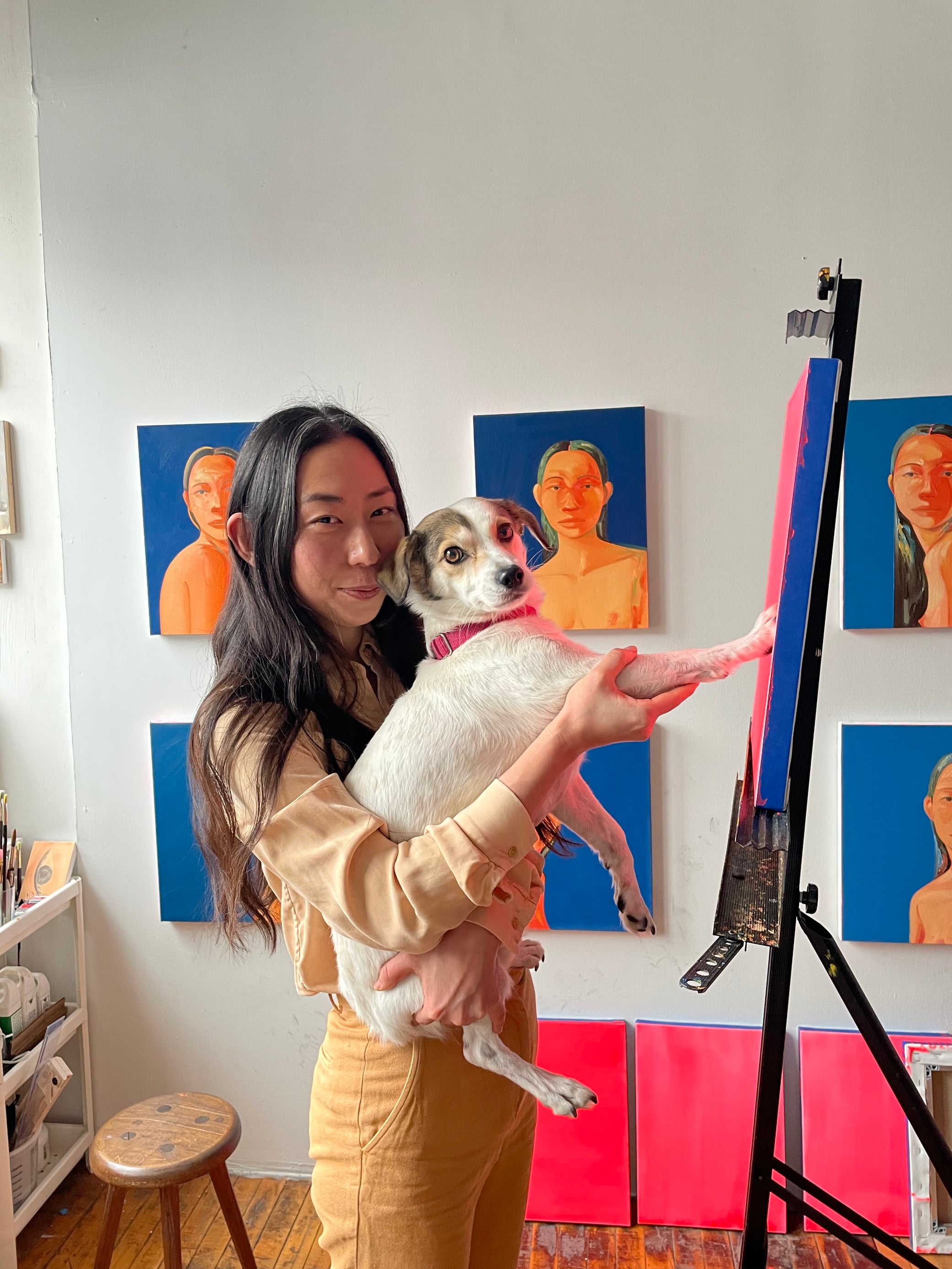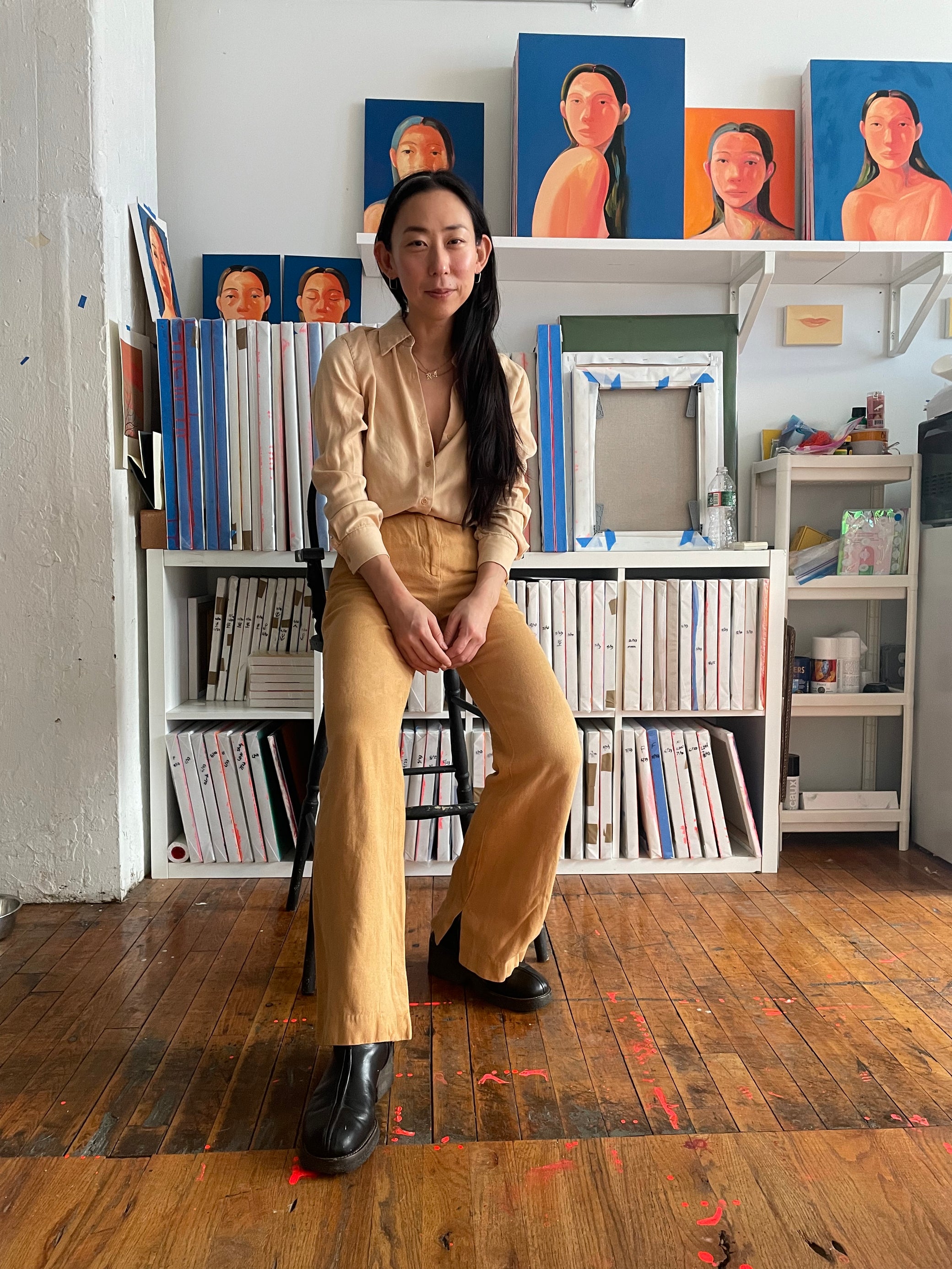 Na Kim at her studio with her paintings and tools.