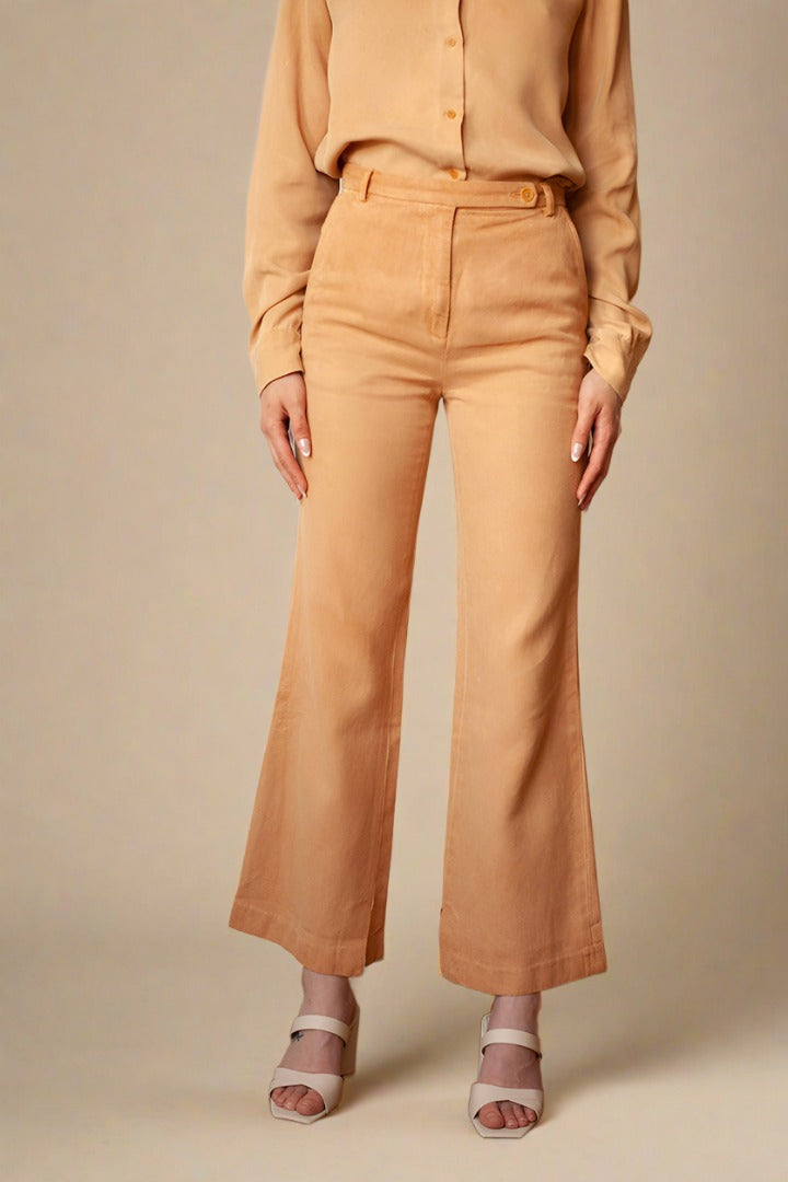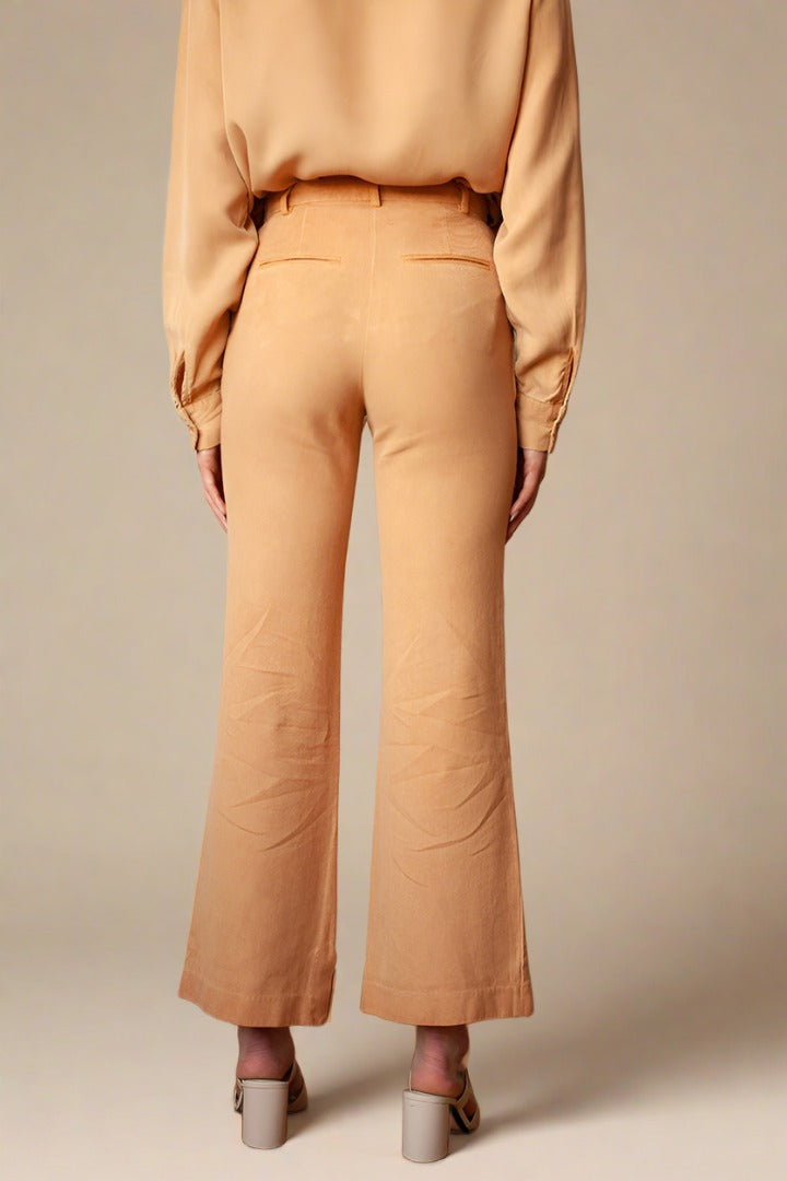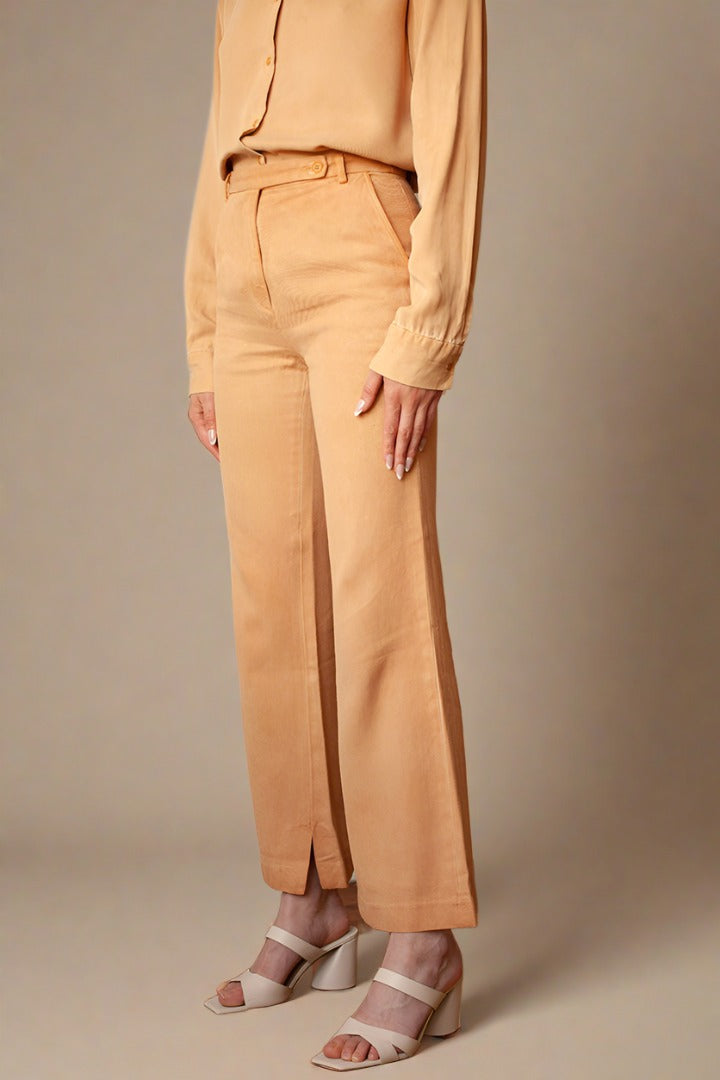 Mid-rise pants with slanted side pockets, back double welt pocket, belt loops, Inner leg slit