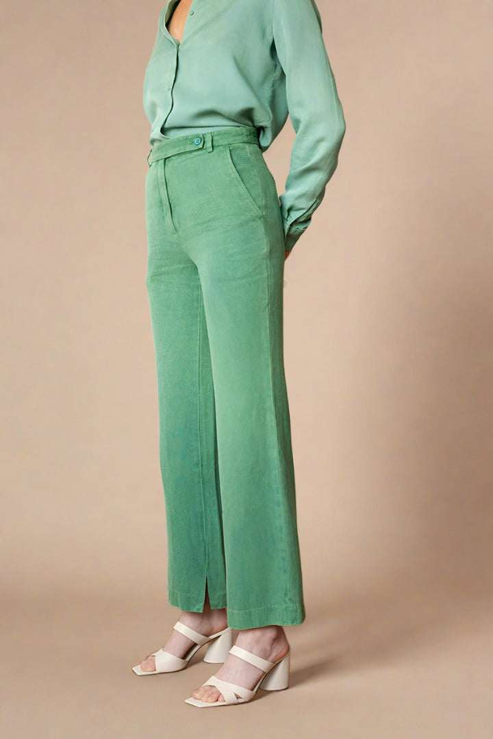 Mid-rise pants with slanted side pockets, back double welt pocket, belt loops, Inner leg slit