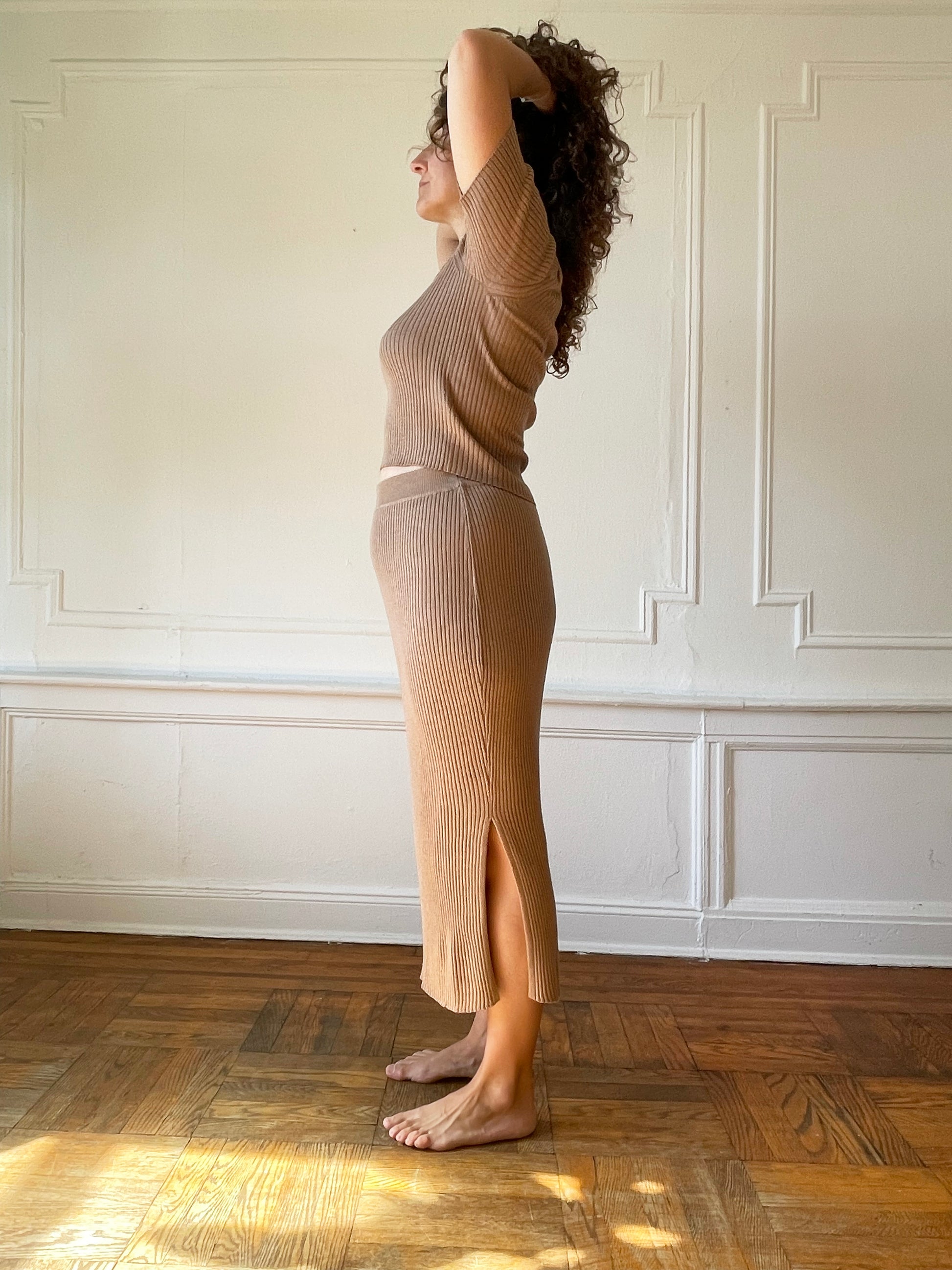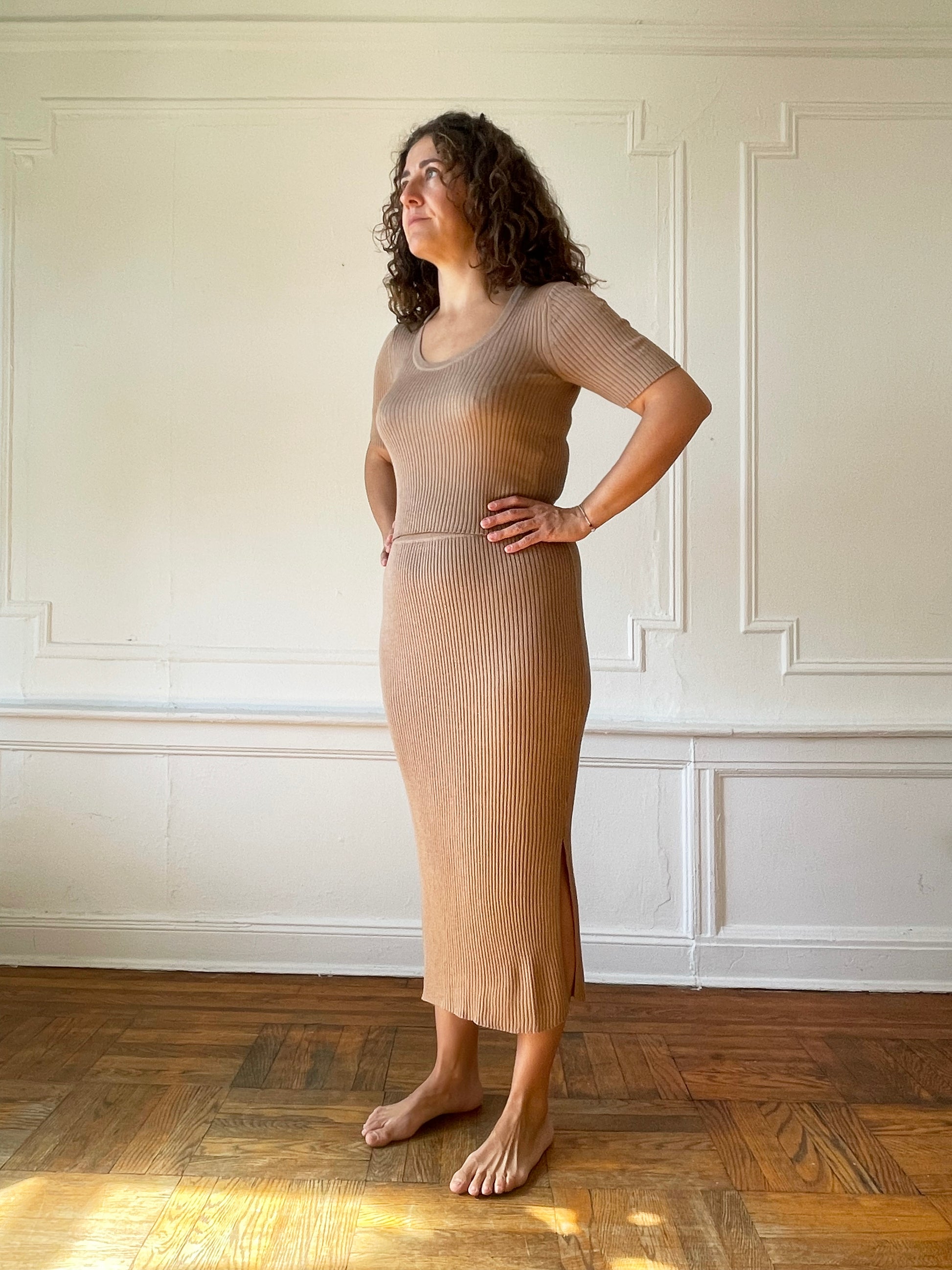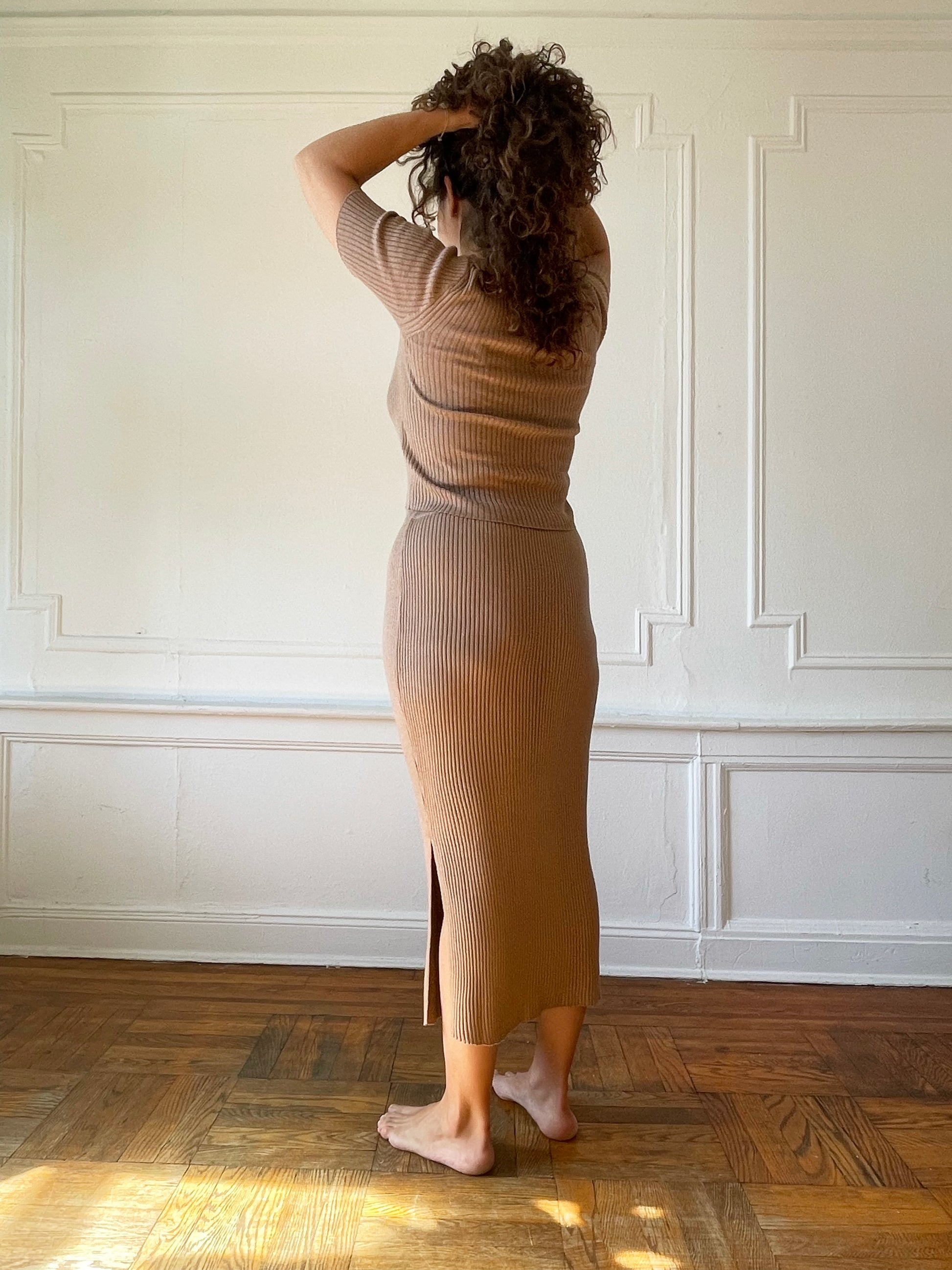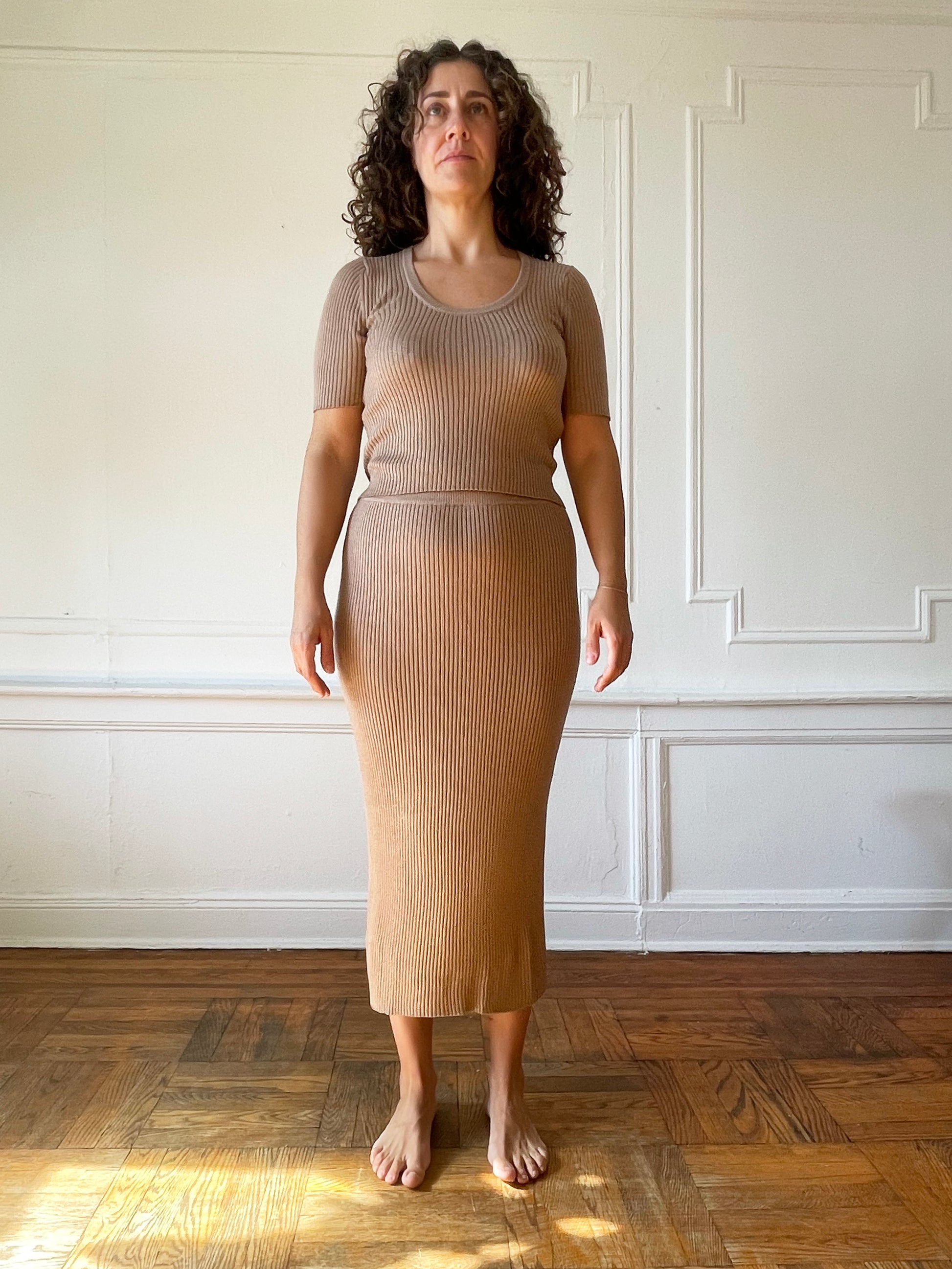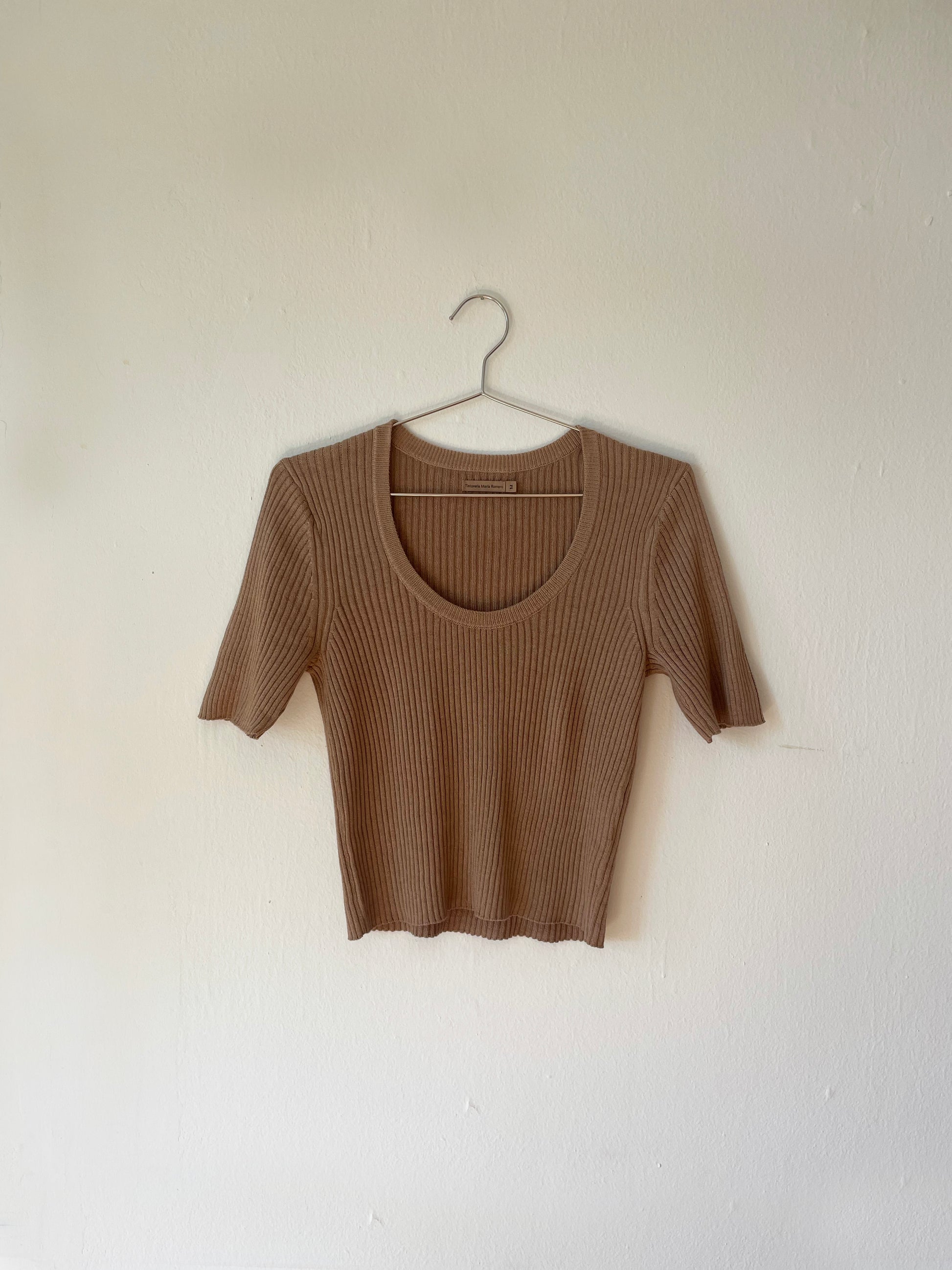 Scoop neck T-Shirt with short sleeves. 3x2 ribbed detailing throughout.